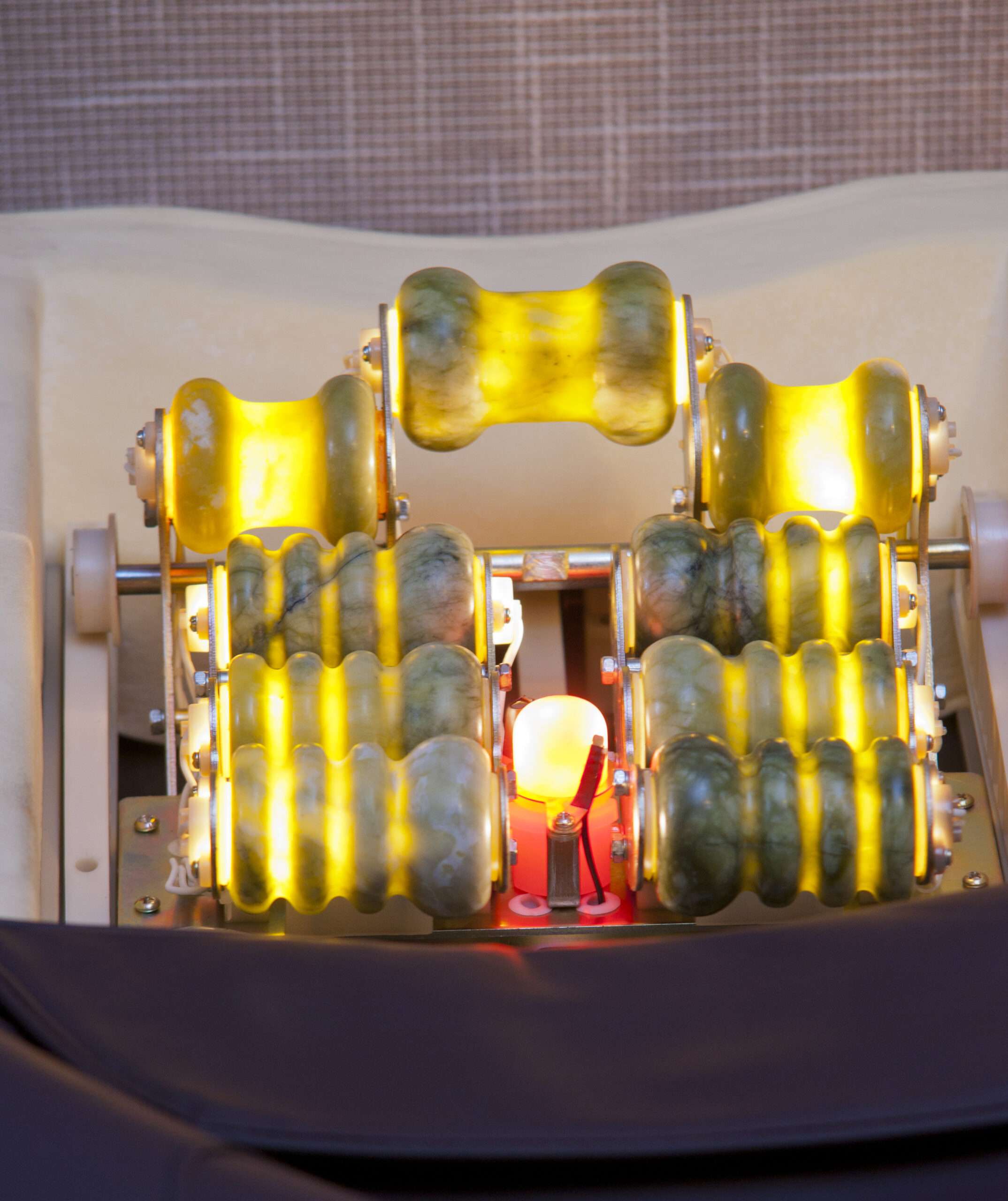 Spre deosebire de scaune, patul CASA JAD lucreaza in pozitie orizontala, folosind greutatea corpului tau pentru a aplica presiune pe rolele de jad (presopunctura inversa). Aceasta permite o elongatie reala a coloanei si o penetrare mult mai profunda a caldurii infrarosii.